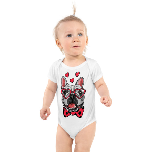 Cute French Bulldog Dog with Funny Pink Heart Glasses Bodysuit, No. 0198