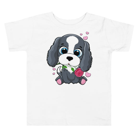 Cute Little Puppy Dog Holding Flower T-Shirt, No. 0218