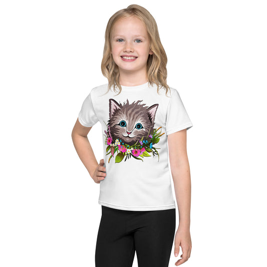 Cute Cat Face with Flowers Wreath Around the Neck T-shirt, No. 0155