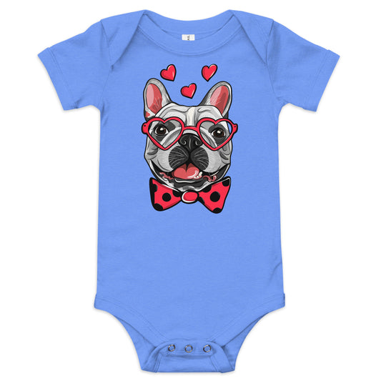 Cute French Bulldog Dog with Funny Pink Heart Glasses Bodysuit, No. 0198