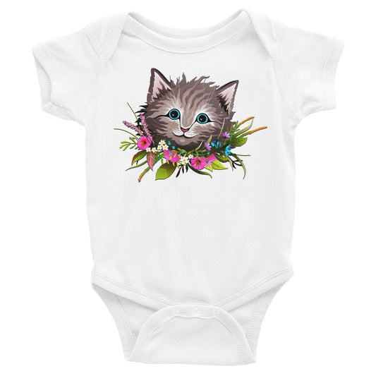 Cute Cat Face with Flowers Wreath Around the Neck, Bodysuits, No. 0155