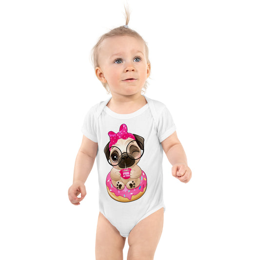 Cute Little Pug Dog Sitting in Donut Bodysuit, No. 0365