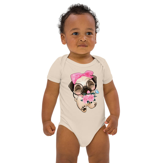Cute Little Pug Dog Holding Roses Bodysuit, No. 0362