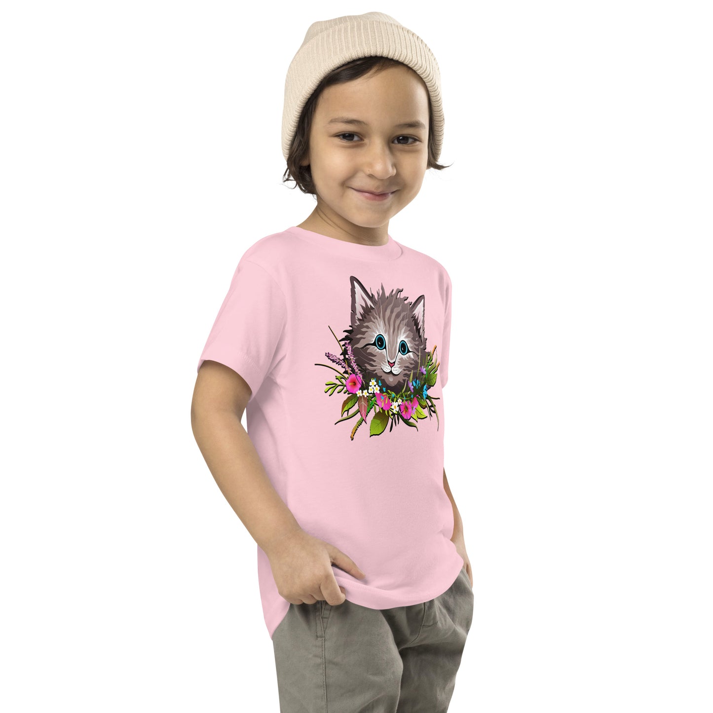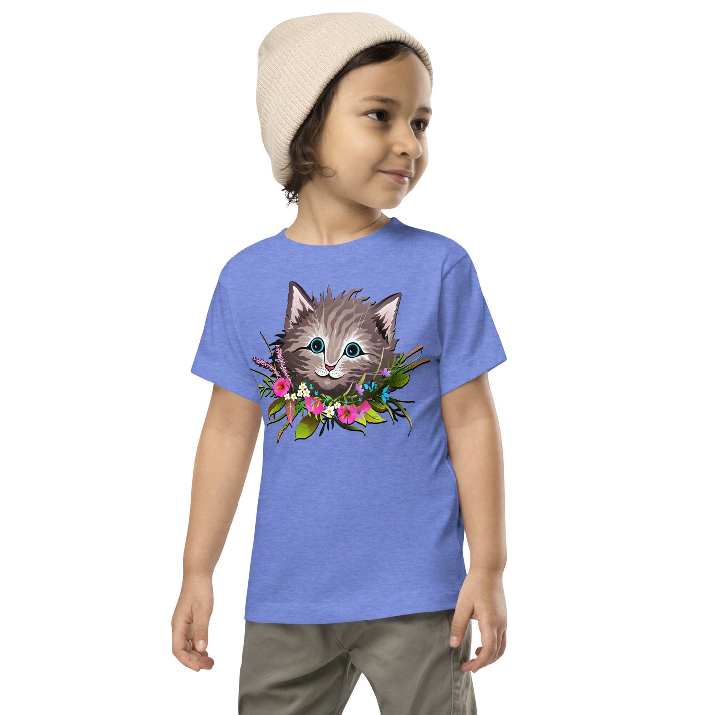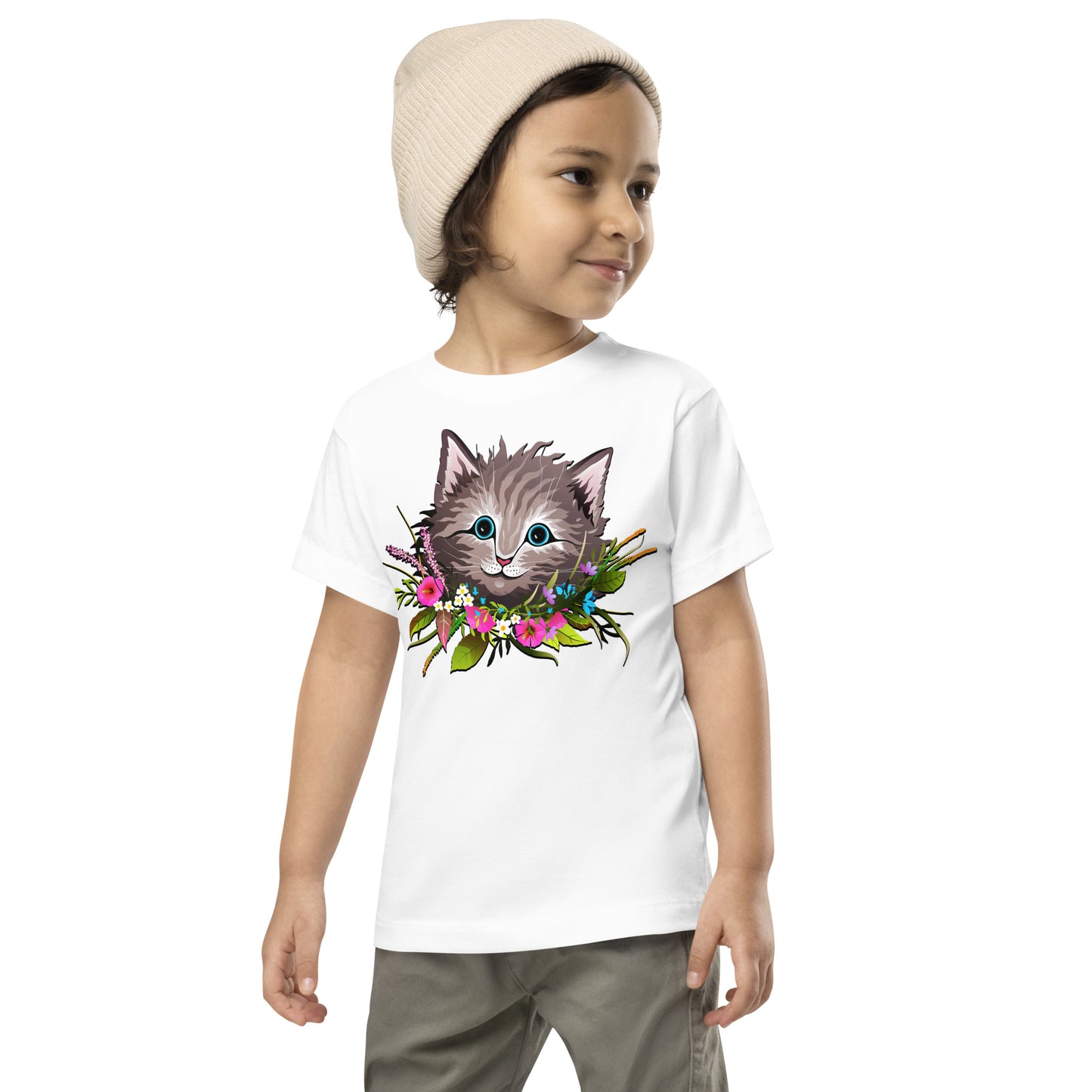 Cute Cat Face with Flowers Wreath Around the Neck T-shirt, No. 0155