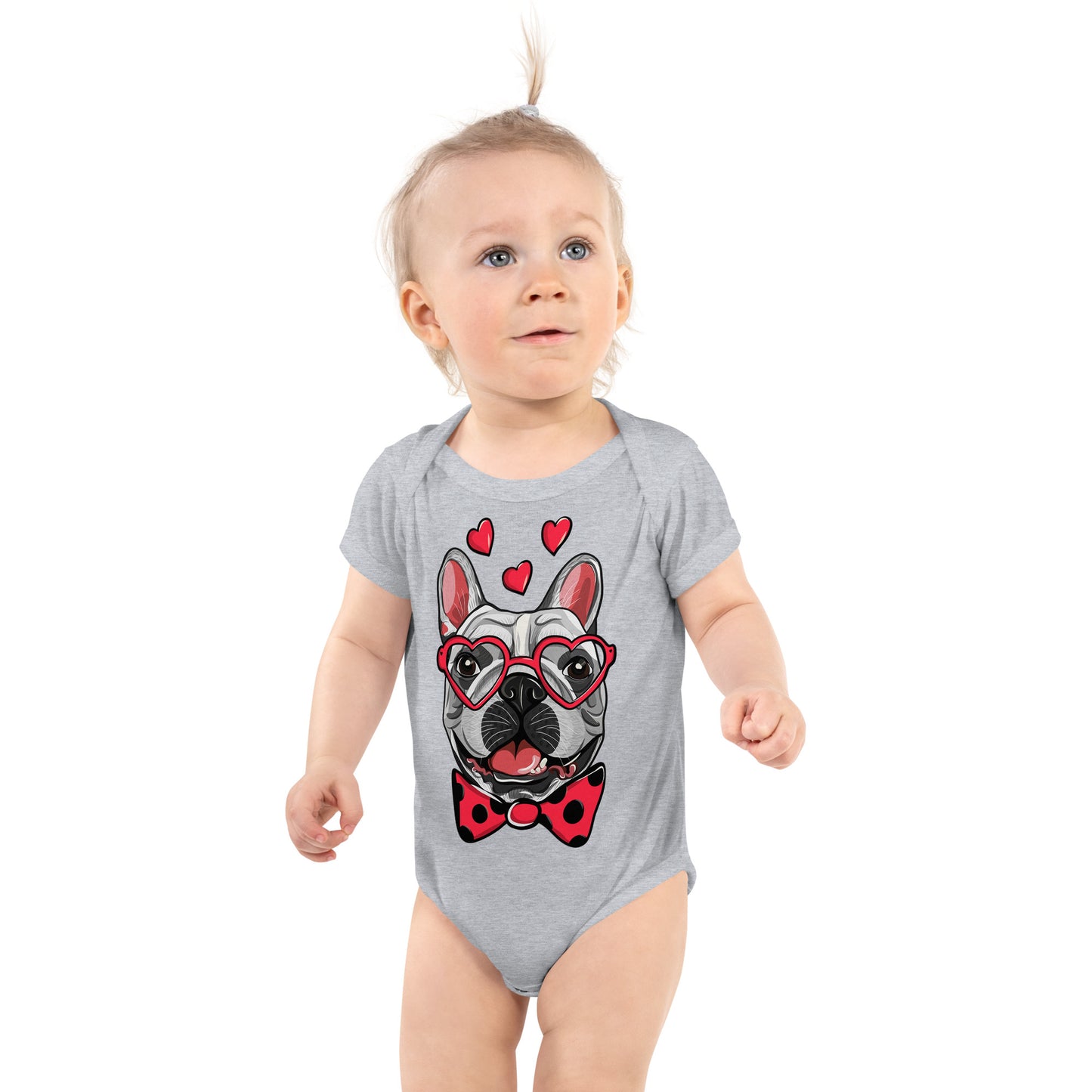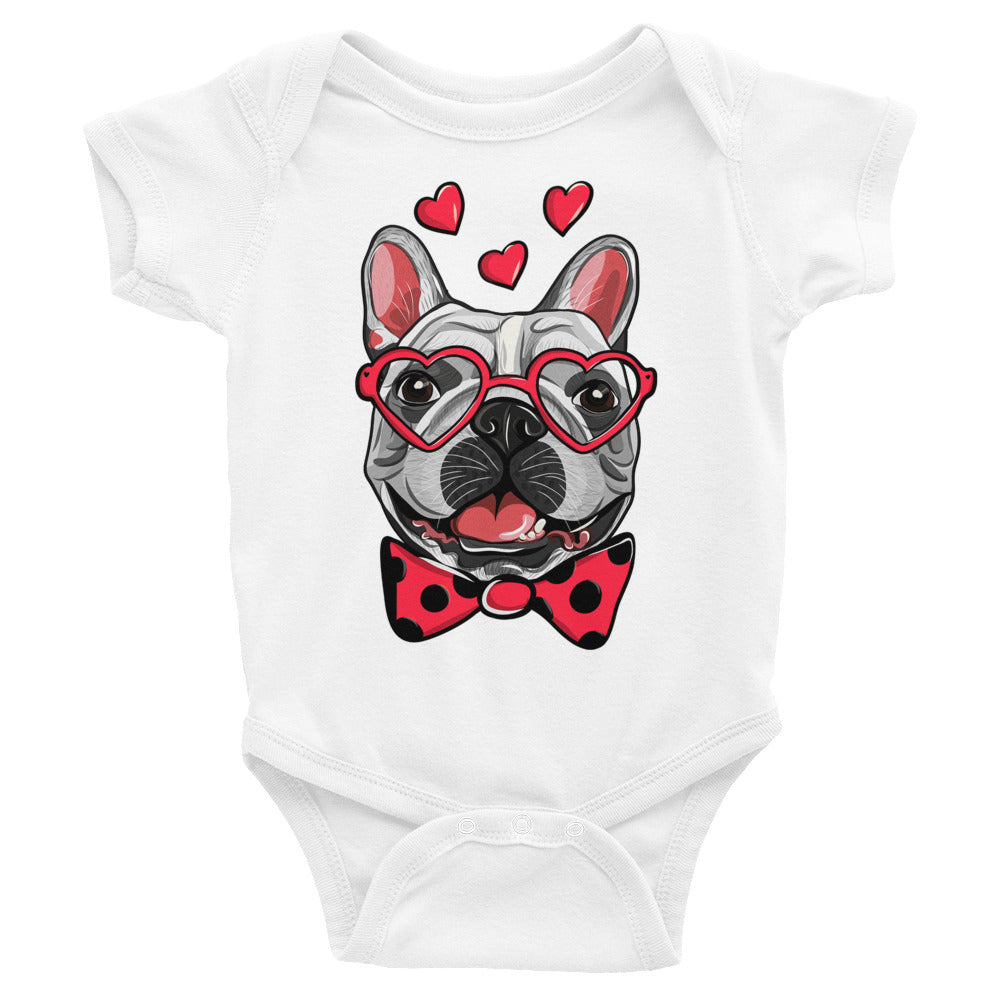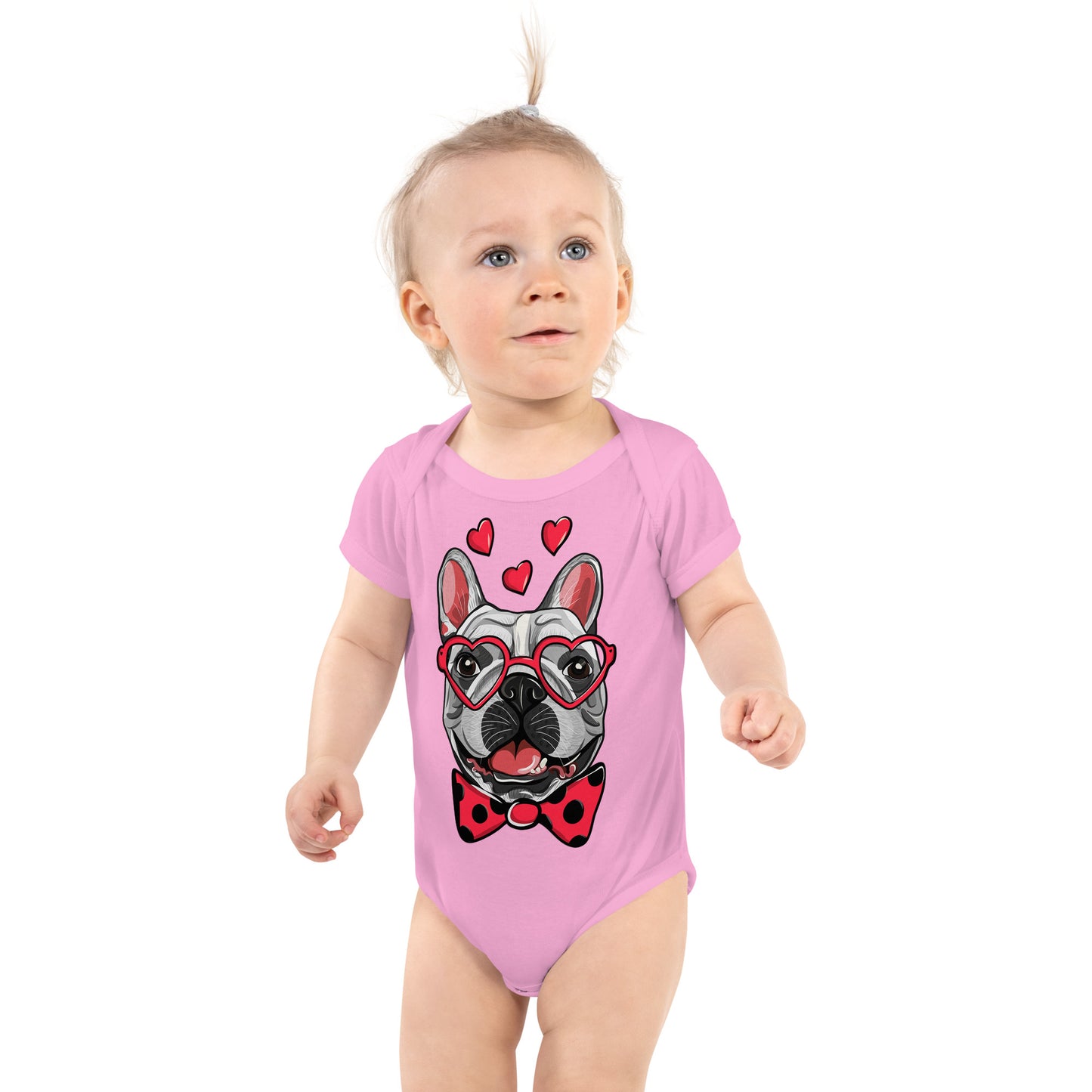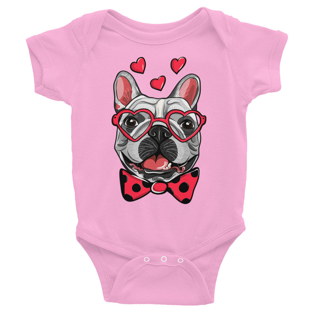 Cute French Bulldog Dog with Funny Pink Heart Glasses Bodysuit, No. 0198