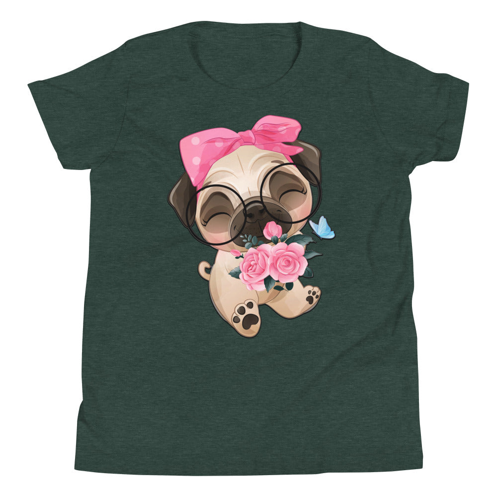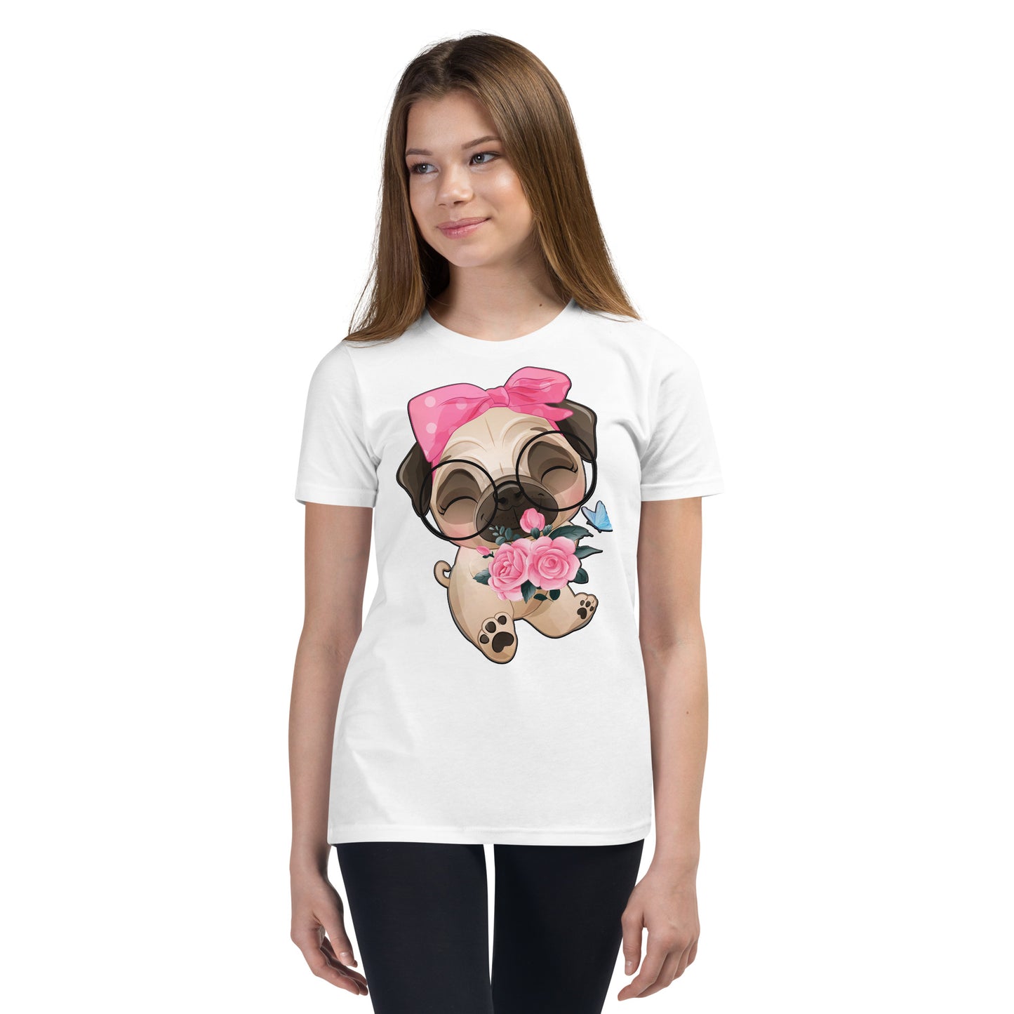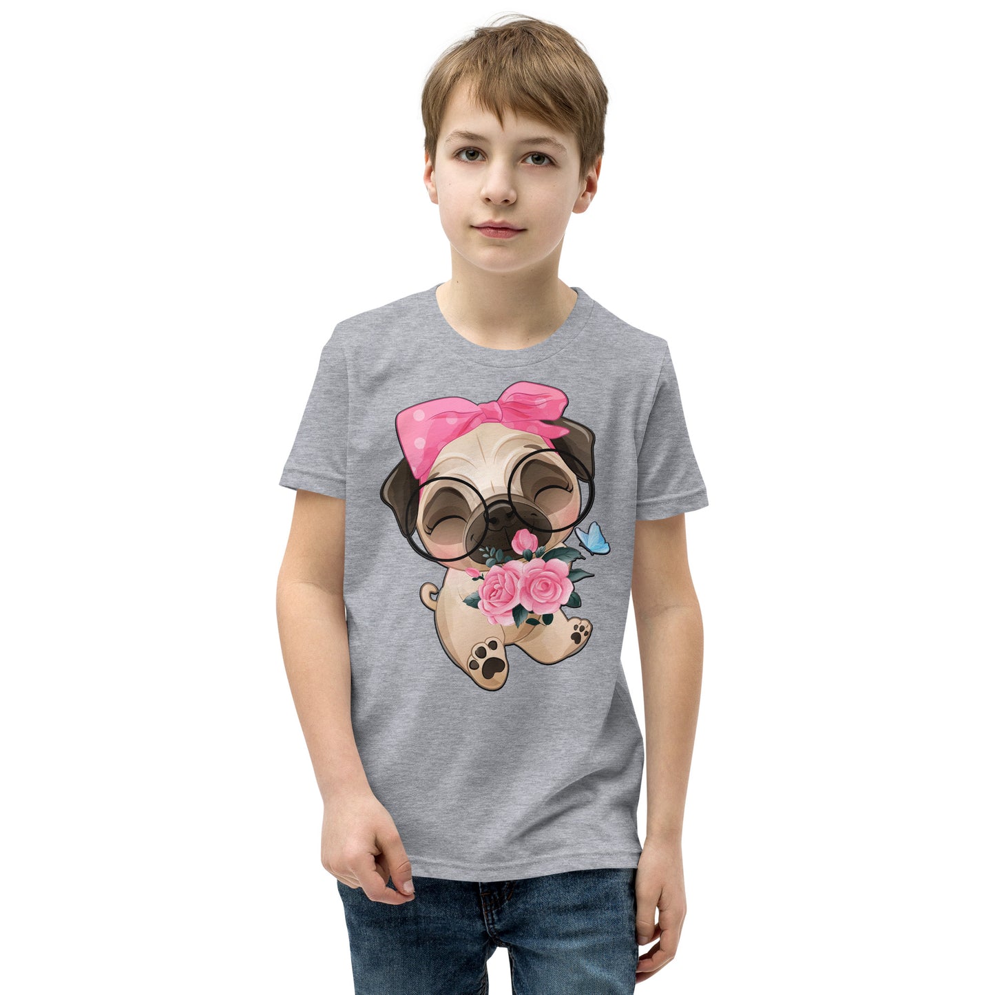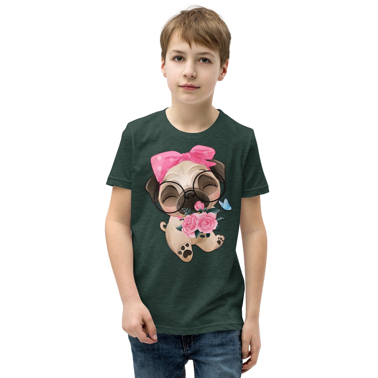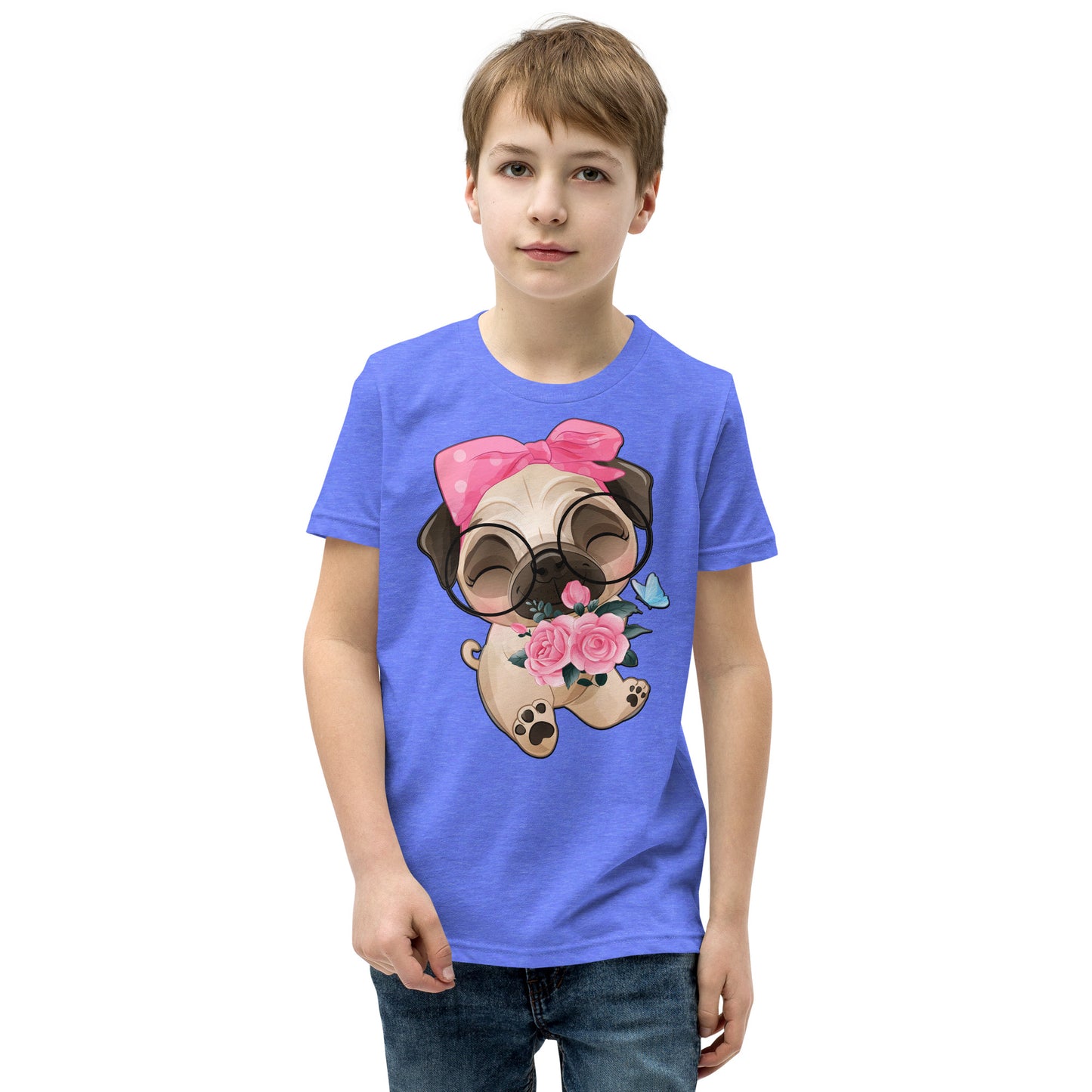 Cute Little Pug Dog Holding Roses T-shirt, No. 0362