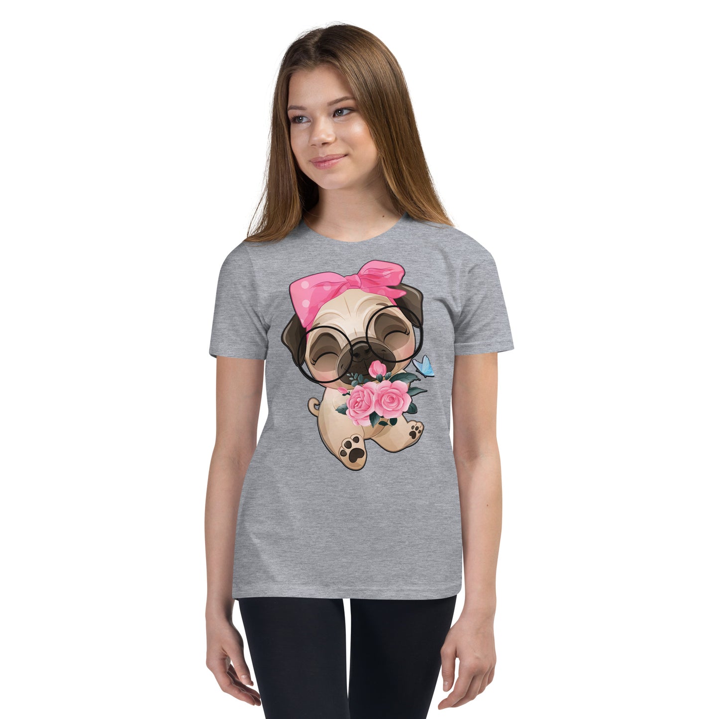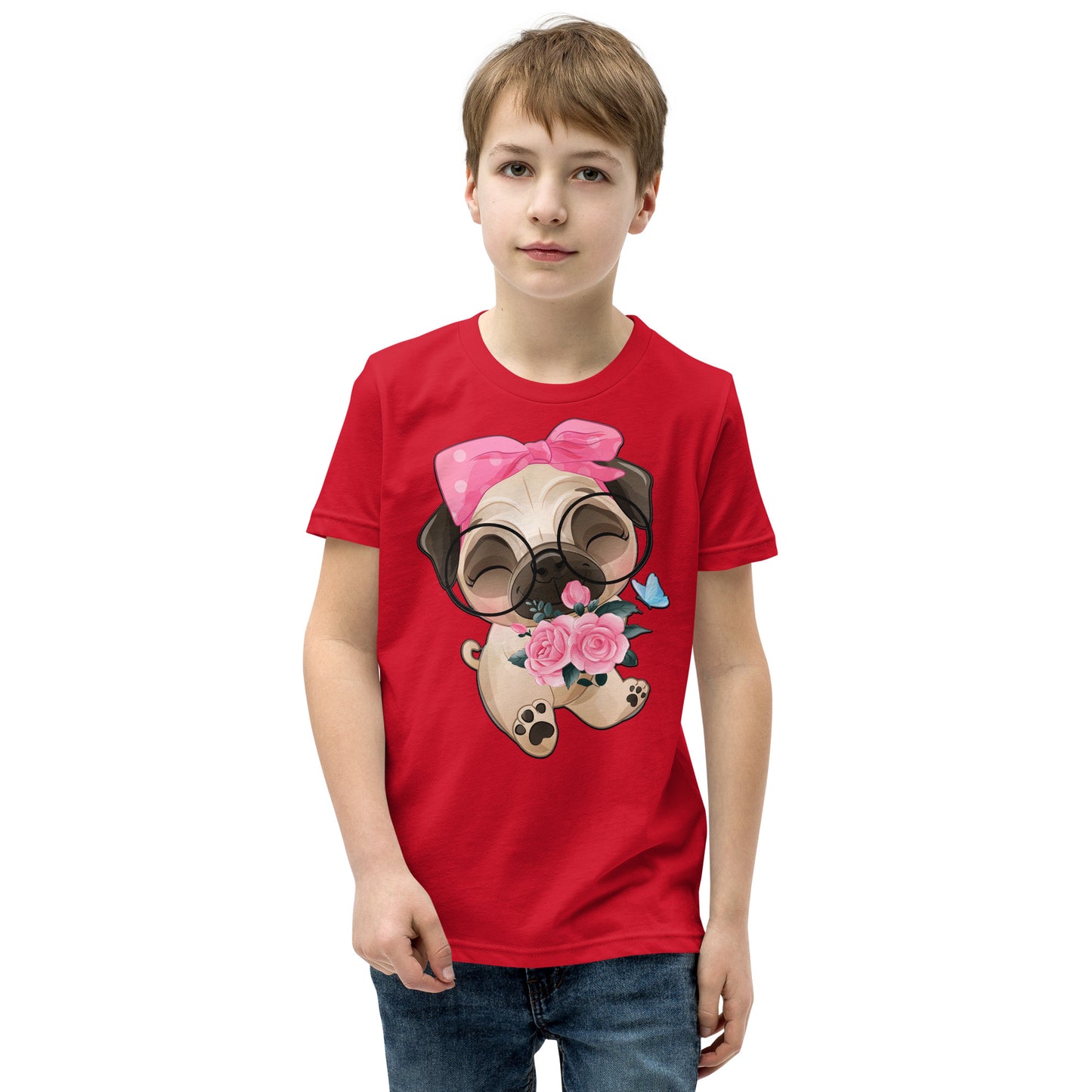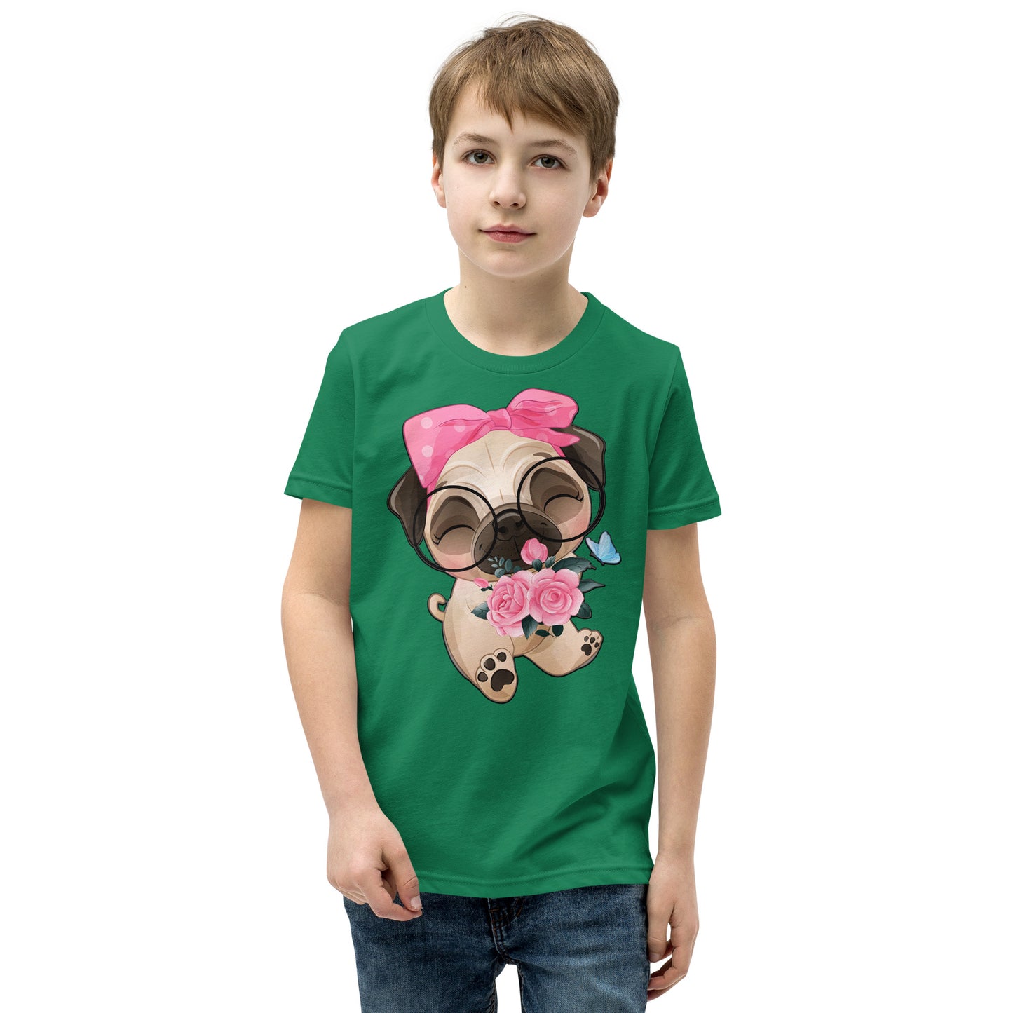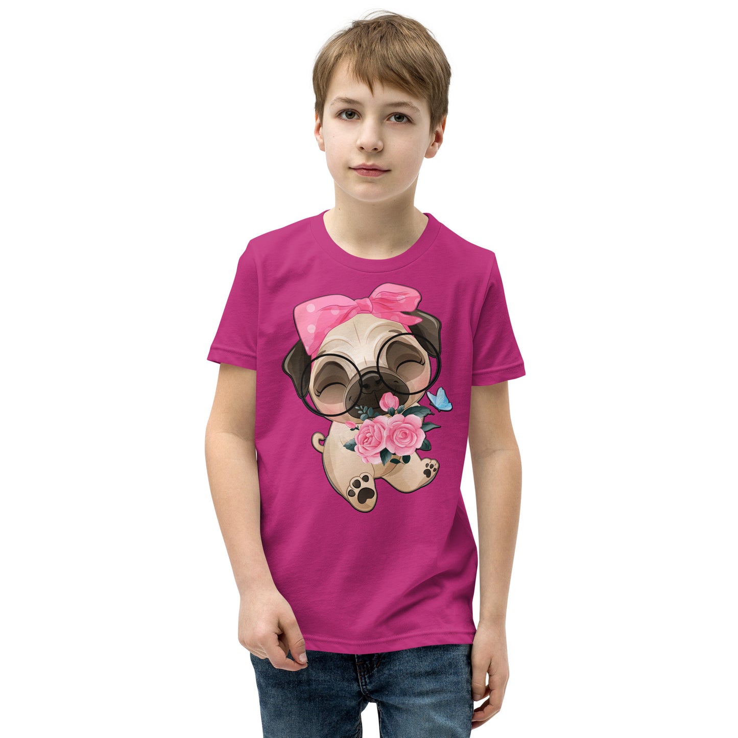 Cute Little Pug Dog Holding Roses T-shirt, No. 0362