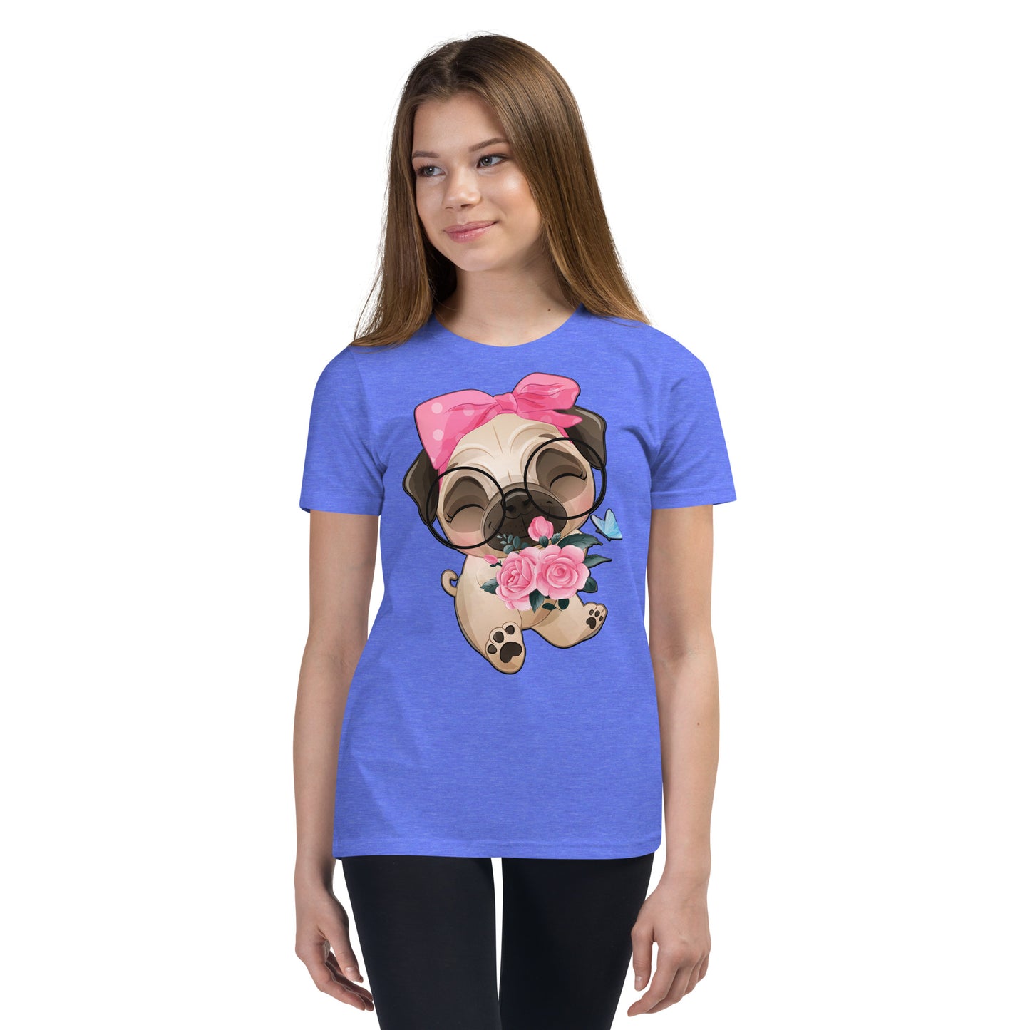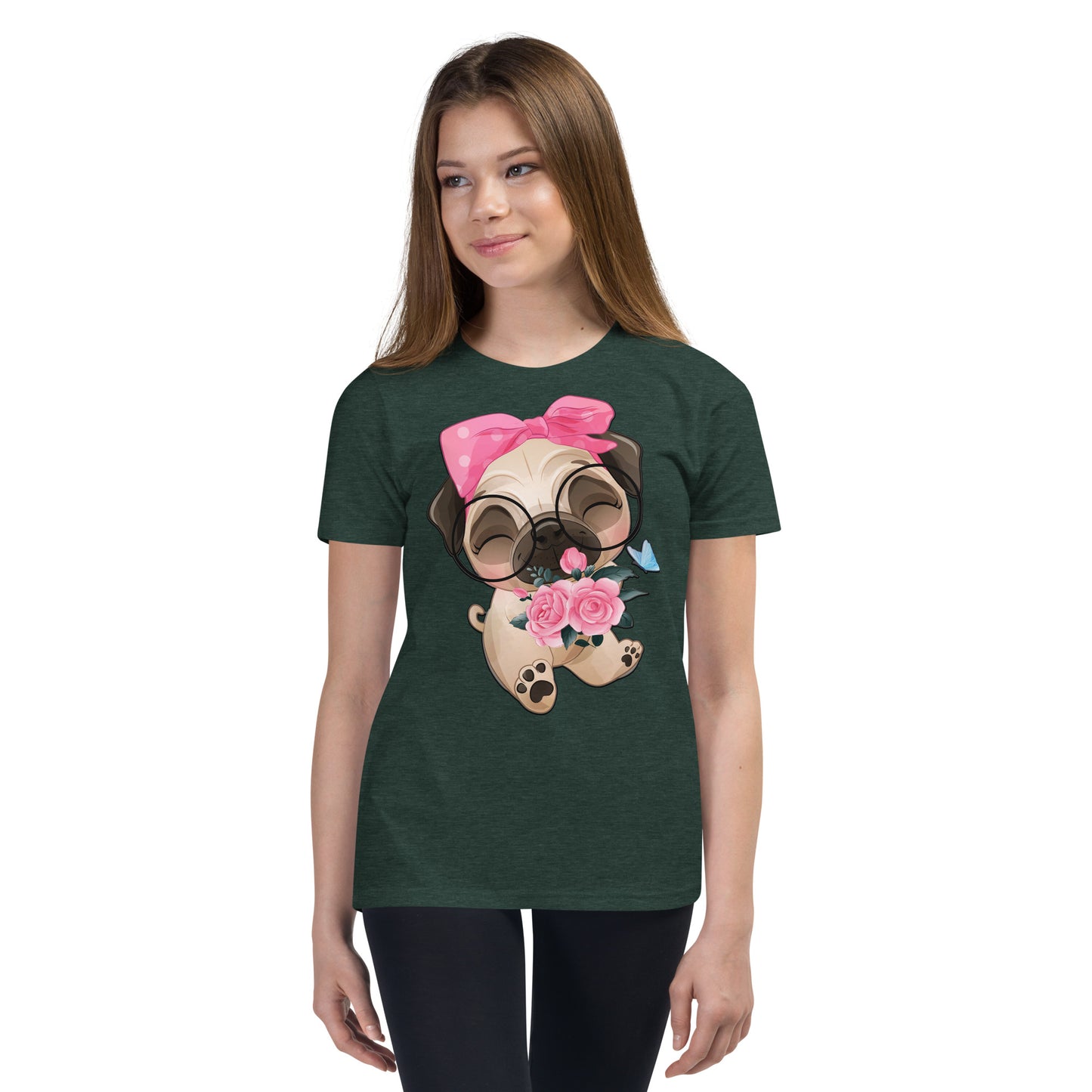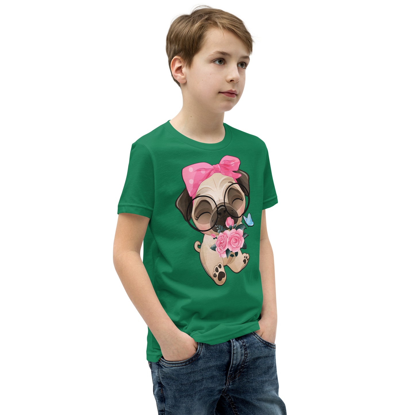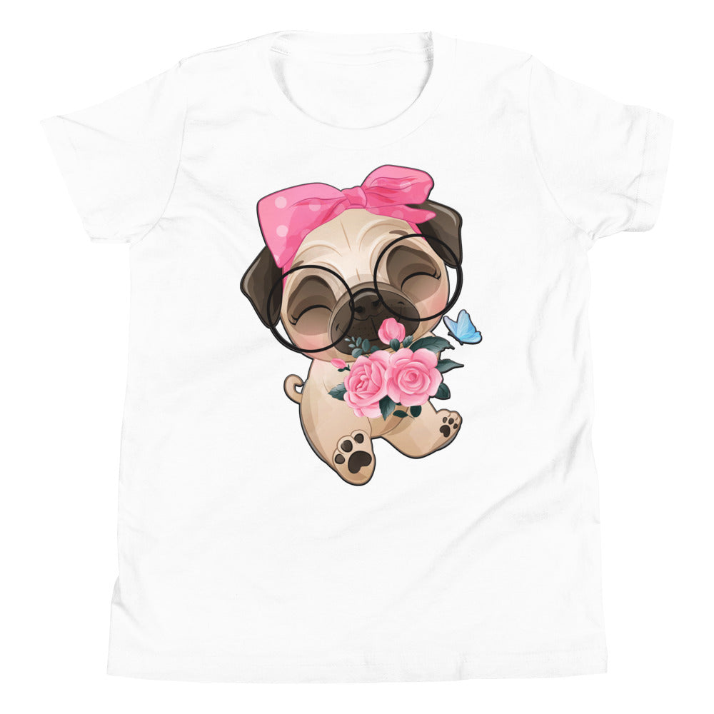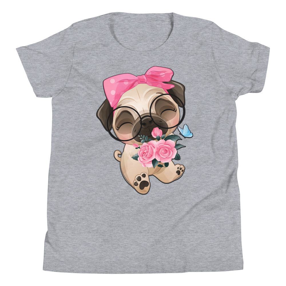 Cute Little Pug Dog Holding Roses T-shirt, No. 0362