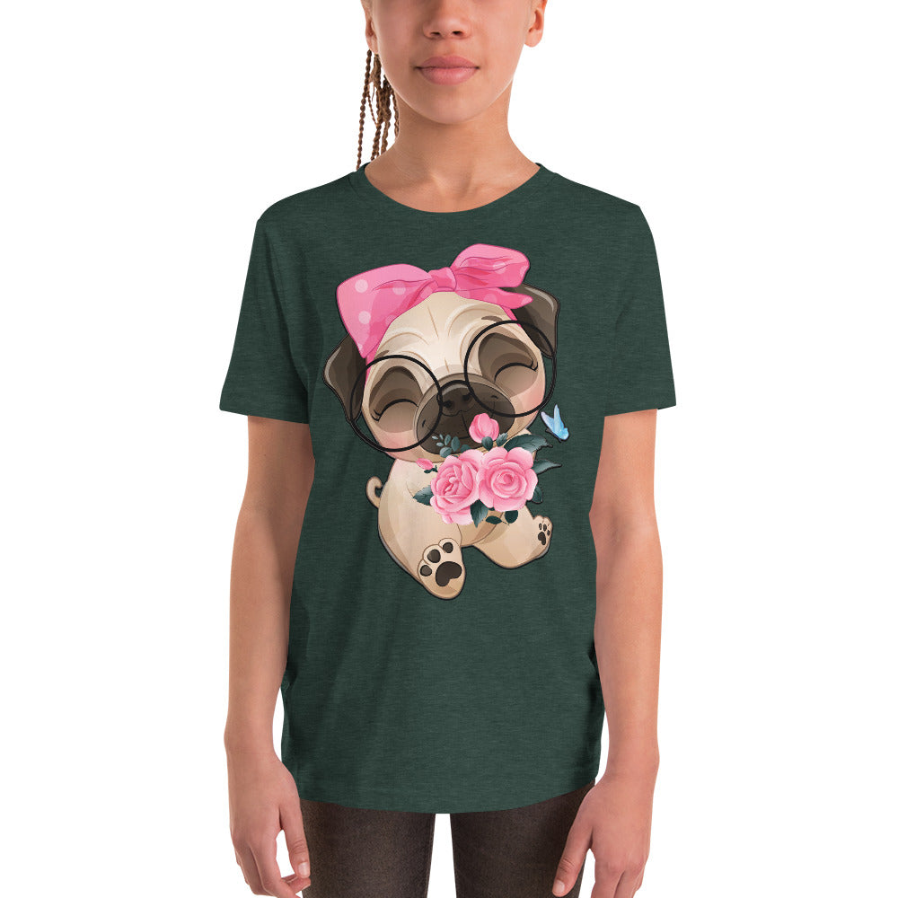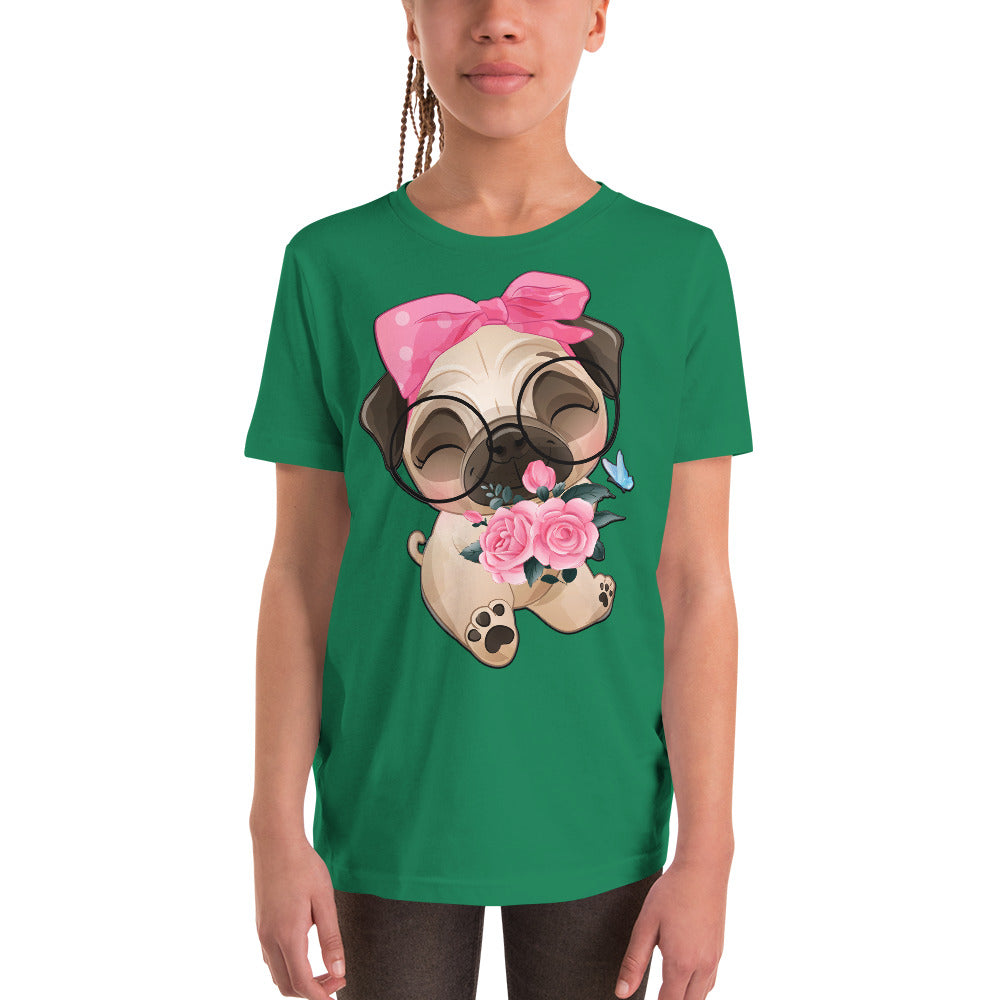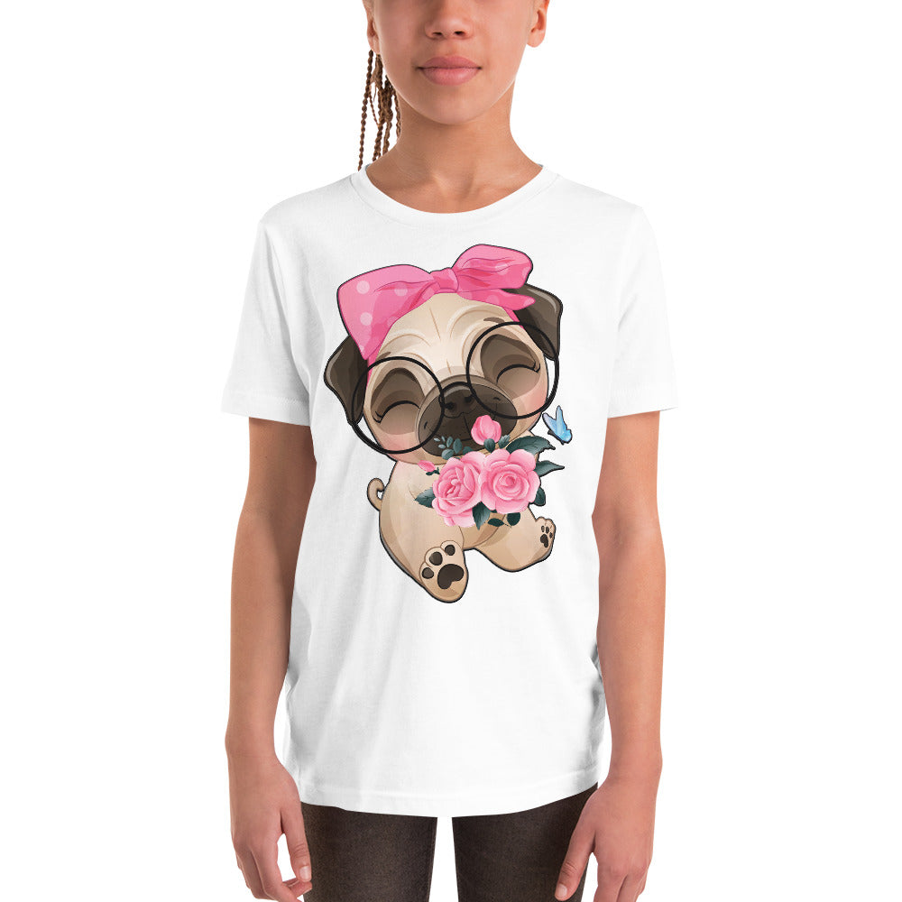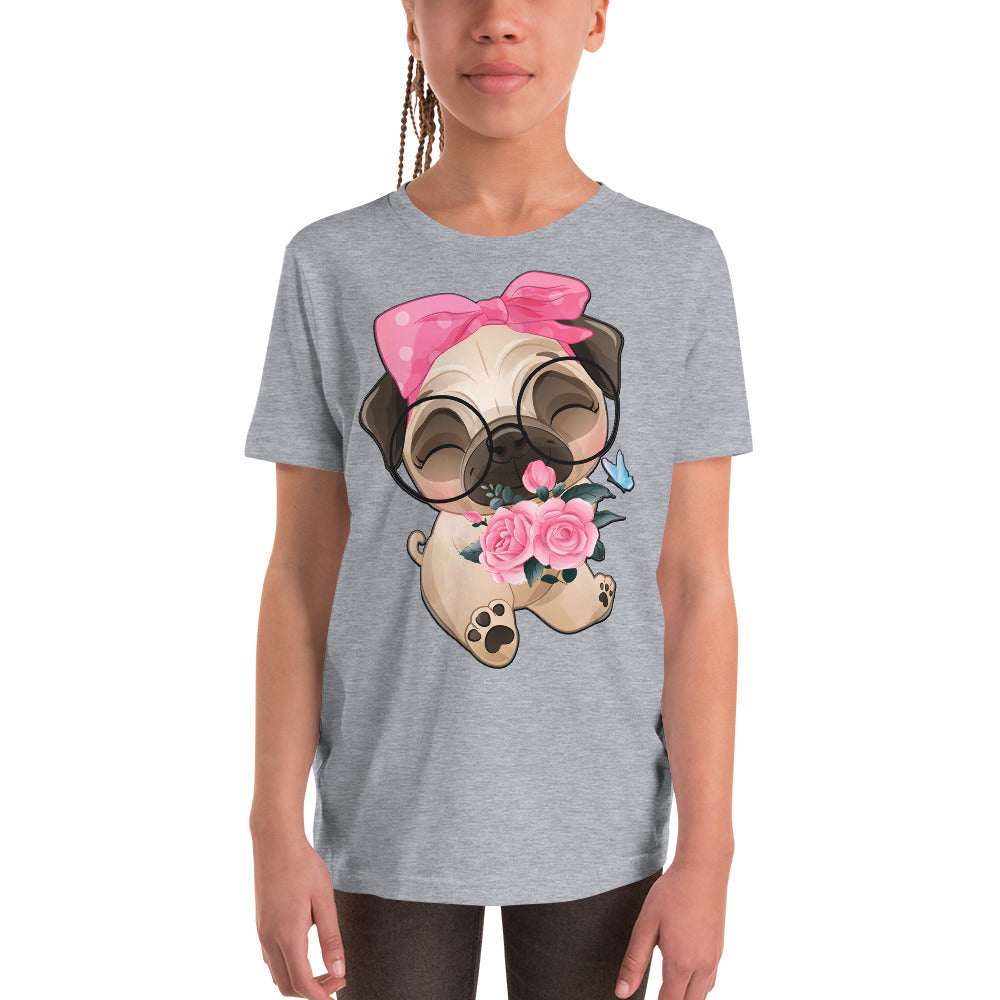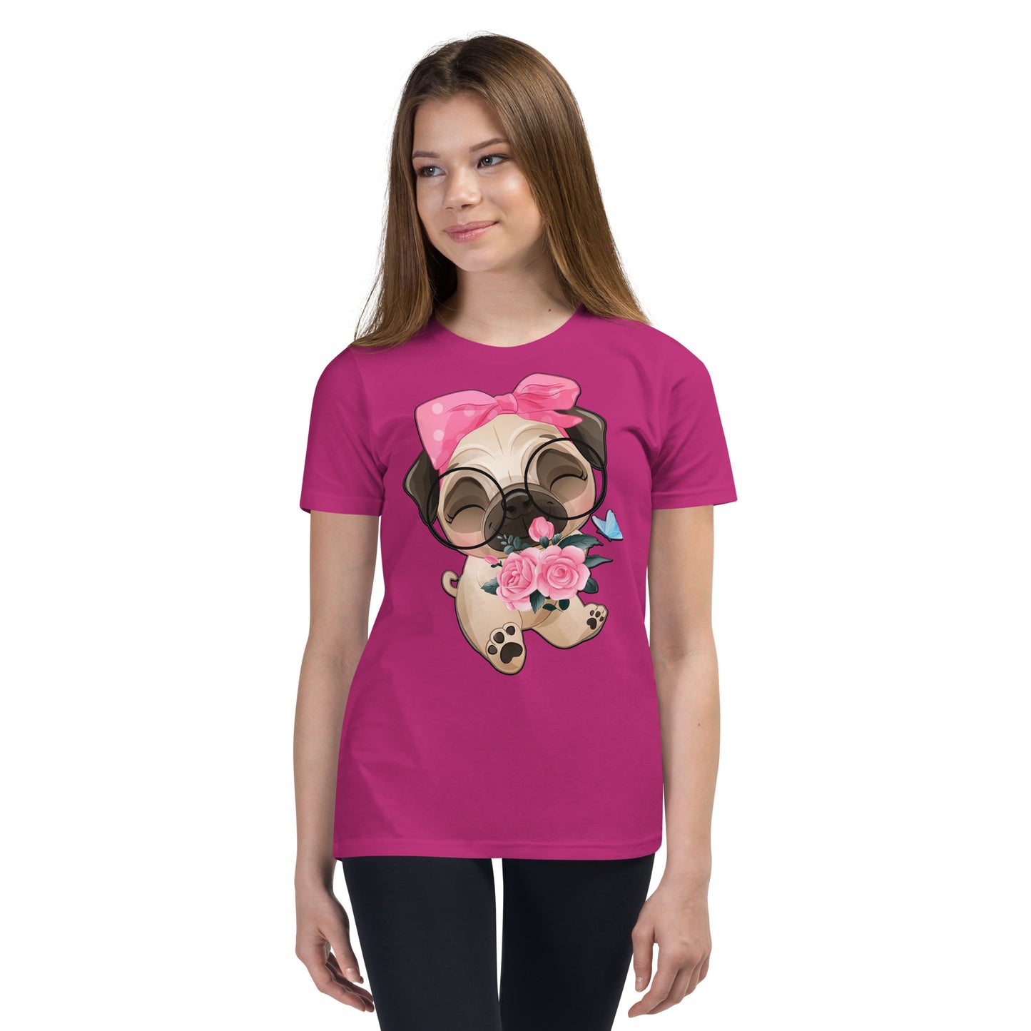 Cute Little Pug Dog Holding Roses T-shirt, No. 0362