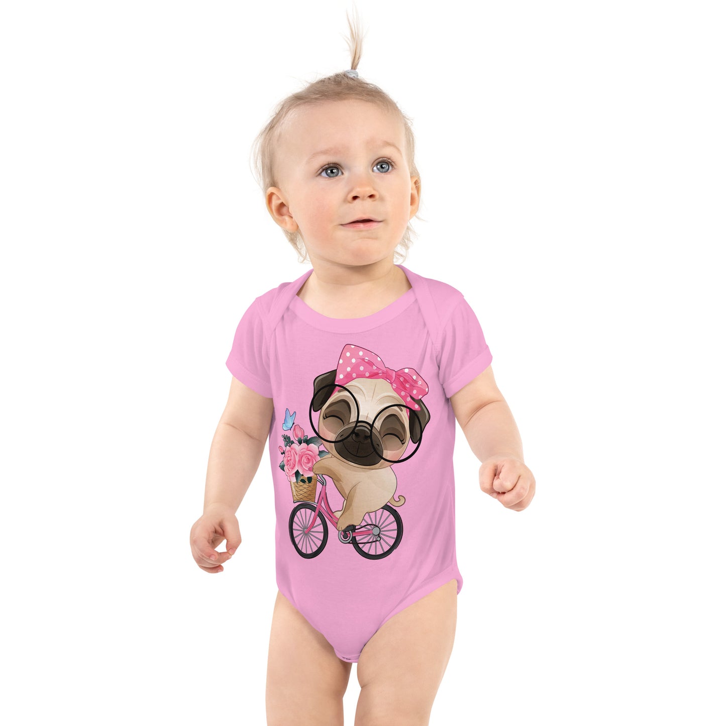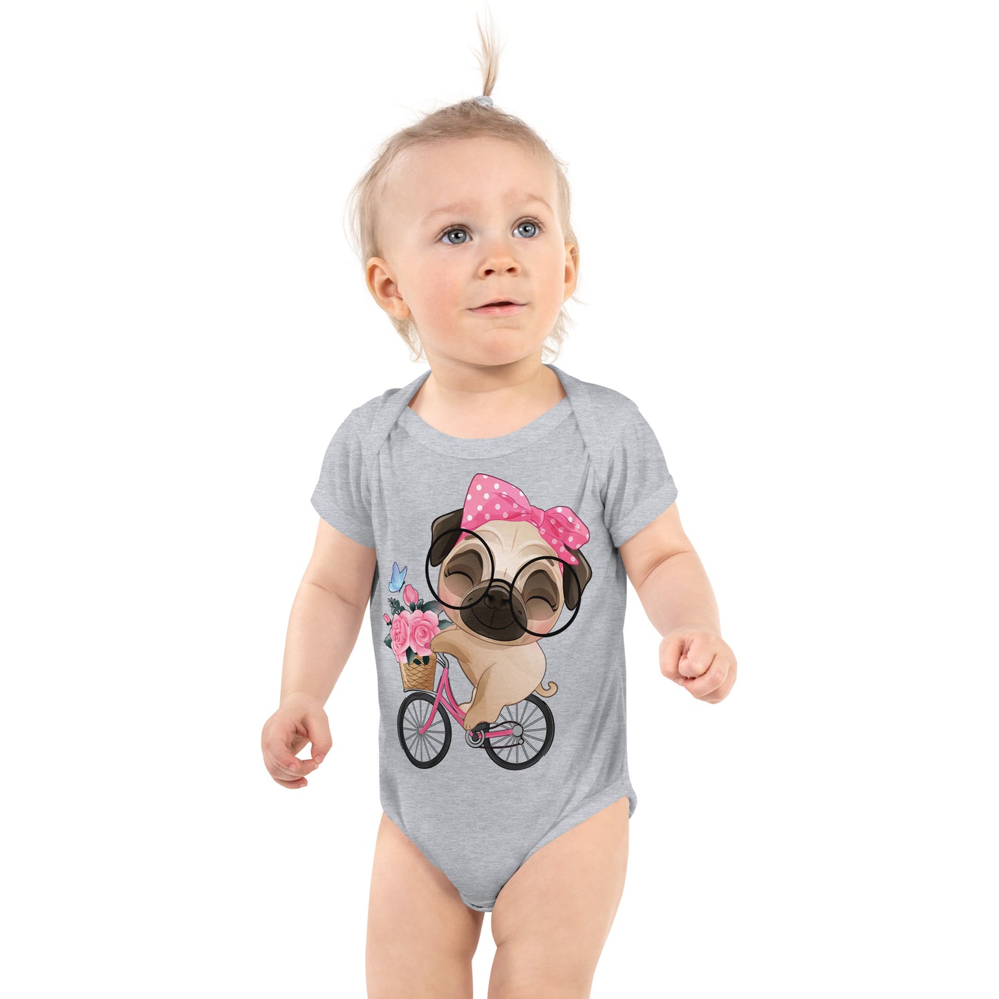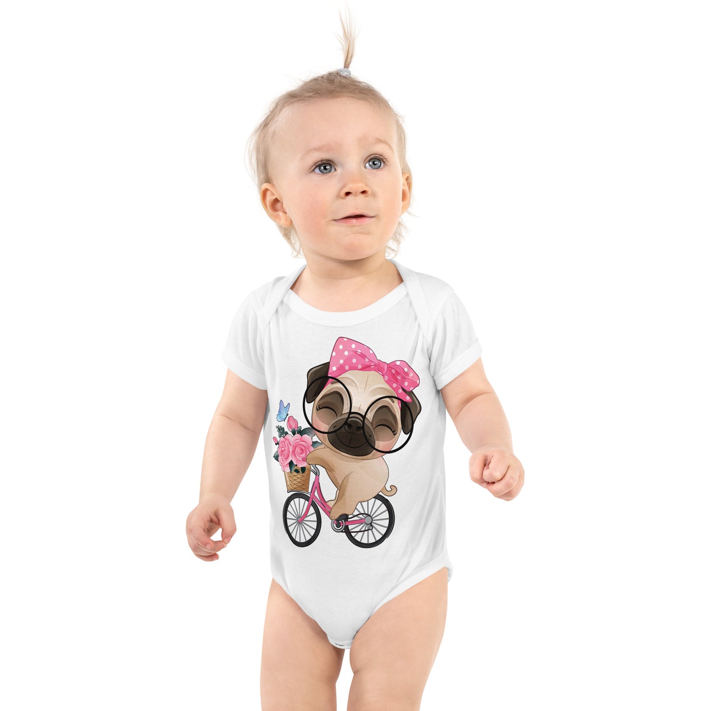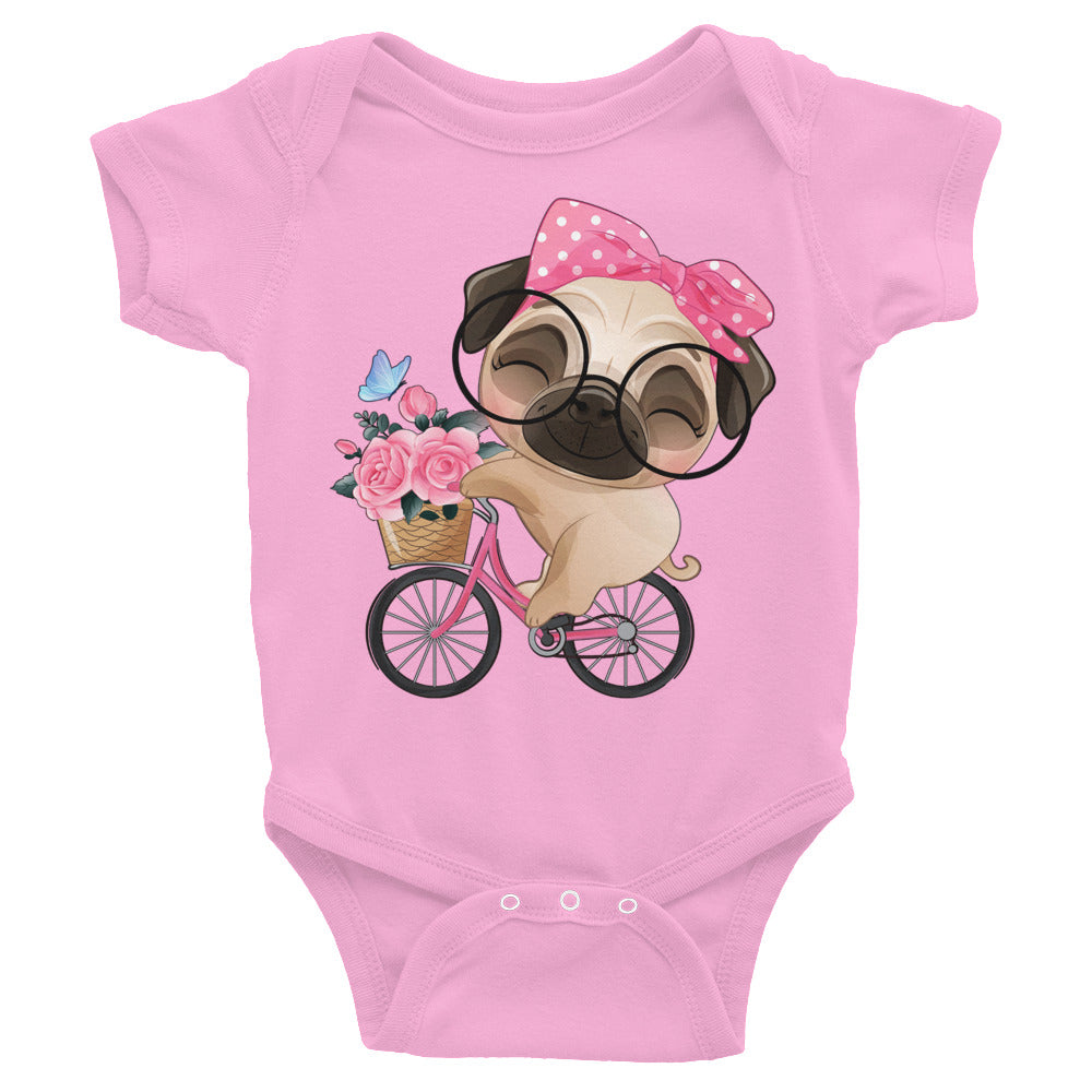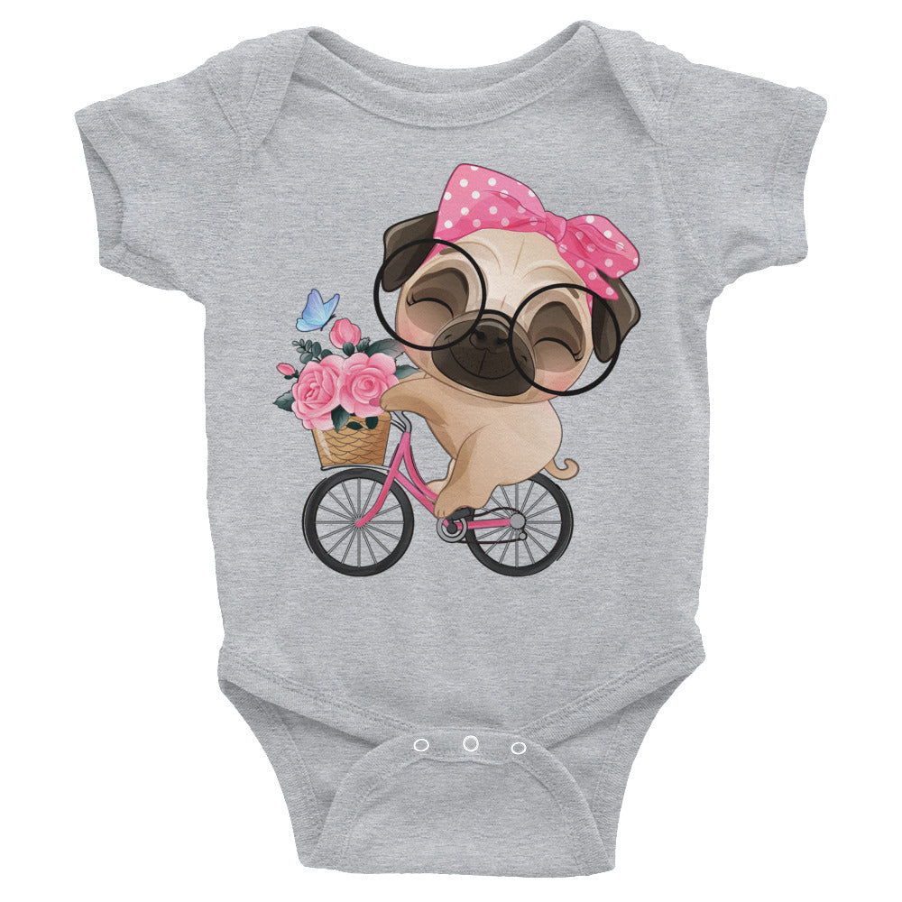 Cute Little Pug Dog Riding Bicycle Bodysuit, No. 0364